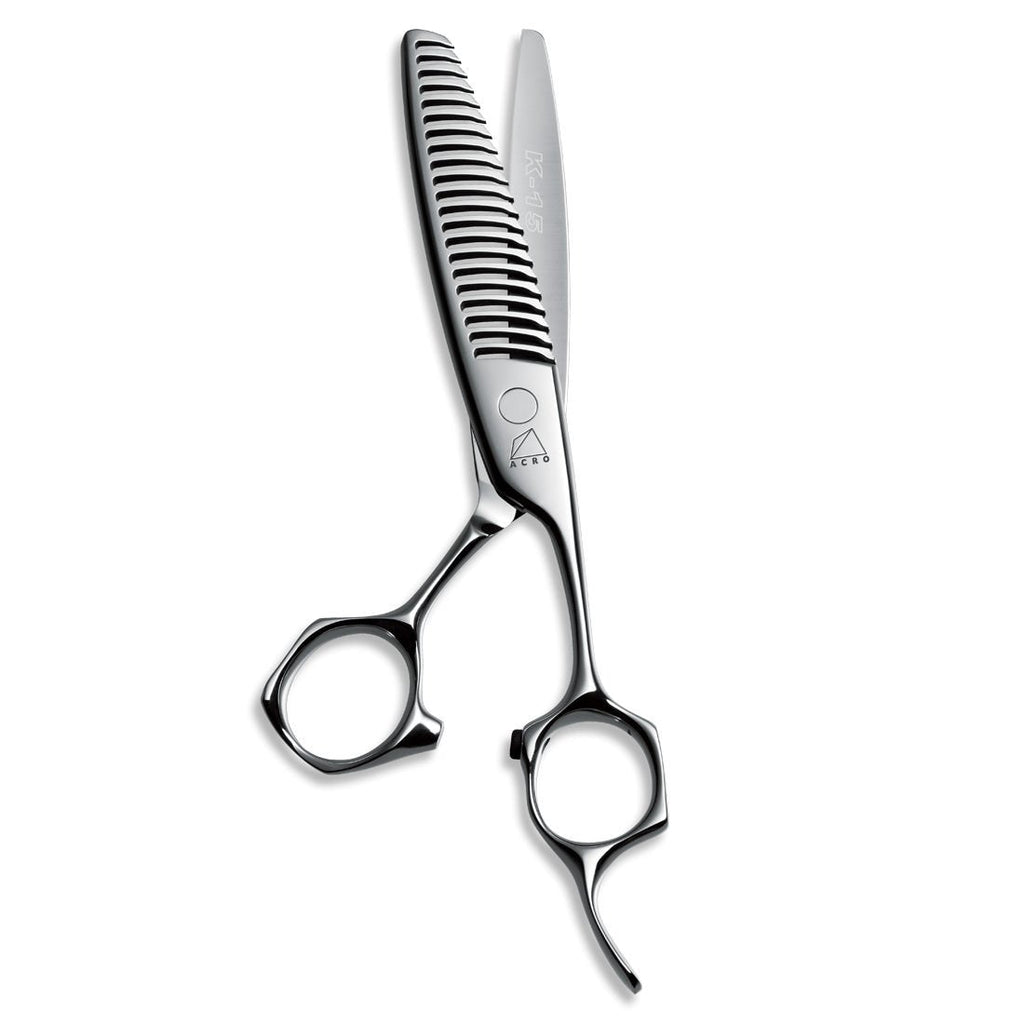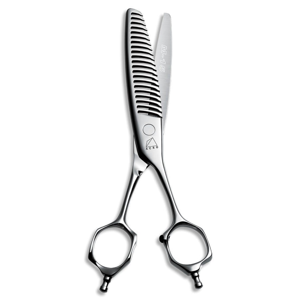ACROLEAF Wide 15 Thinning LEFTY scissors offer optimal control for popular bob and layered wave styles due to their unique design. This revolutionary tool allows the user to adjust both volume and texture with a simple angle shift, reducing or increasing the cut ratio. Cut horizontally for a lesser cut percentage, or vertically for more, making this thinning scissor both convenient and versatile. It's a great choice for precision thinning and texture control.