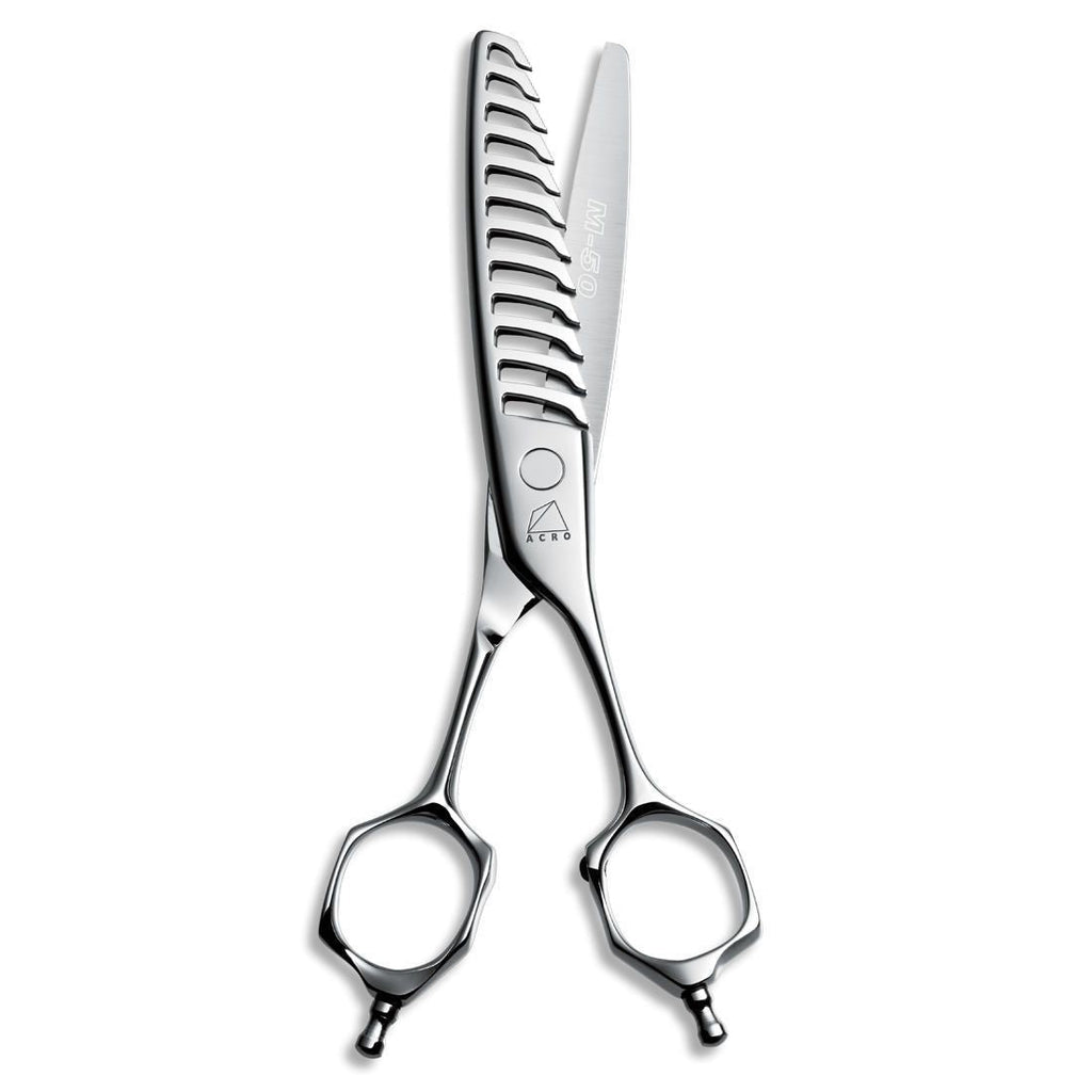 ACROLEAF Wide 50 LEFTY Thinning scissors offer optimal control for popular bob and layered wave styles due to their unique design. This revolutionary tool allows the user to adjust both volume and texture with a simple angle shift, reducing or increasing the cut ratio. Cut horizontally for a lesser cut percentage, or vertically for more, making this thinning scissor both convenient and versatile. It's a great choice for precision thinning and texture control.